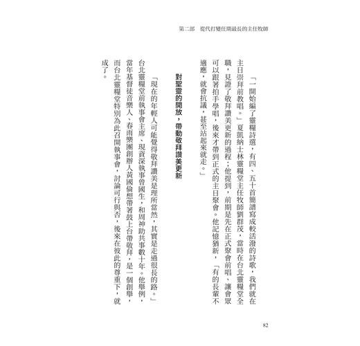 曾國生強調,台北靈糧堂的講台,一路從古老詩歌、到現在的敬拜讚美,都是很謹慎地在眾人漸進式地對齊後才成就的,「這部分周牧師非常有智慧地帶領教會,沒有躁進。」