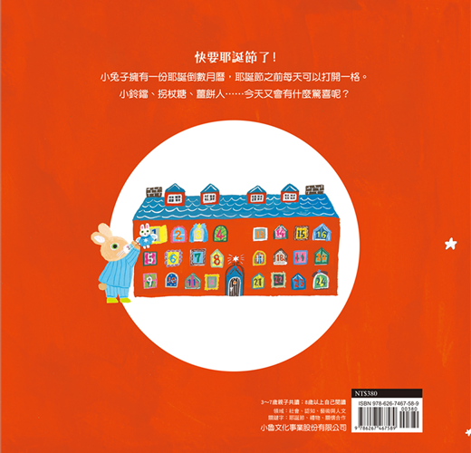 快要耶誕節了!小兔子擁有一份耶誕倒數月曆,裡面裝了24個小禮物,耶誕節之前每天可以打開一格。第一格是小天使掛飾,第二格是吃點心的小叉子,第三格是可愛的小熊玩偶……每天都有不同的驚喜,好好玩喔!同時,小兔子和朋友們也正在為了耶誕節做準備:去森林裡尋找冷杉樹,寫信給耶誕老人,製作薑餅、蠟燭、耶誕花環、織毛襪……這本繪本就像一本耶誕倒數日曆,描繪了耶誕節前令人期待的日子。