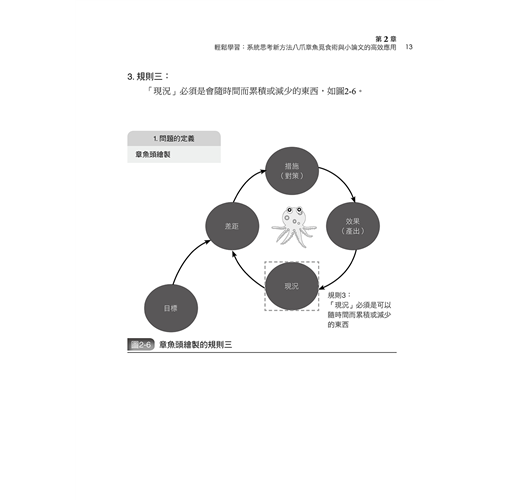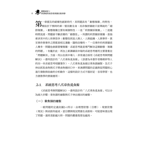 本書與眾不同的地方,在於它的「實戰性」。集結第一線教育人員,歷經課程講授、實作演練與互動討論後,共同撰寫出的系統思考實務操作——八爪章魚覓食術。這種具備發散與收斂的循環分析,在教學界已獲得多方肯定。採用真實教學案例詳細解說,好記、容易學習,也方便教學實作。