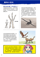 設有「動物小百科」單元,特別介紹霸鶲科動物、鷹科動物和阿根廷鷲屬動物的構造與小常識,以及求偶時會攜帶蝴蝶等昆蟲作為禮物的朱紅霸鶲、總是等其他鳥類築巢後再去霸占巢穴的海盜霸鶲、擁有鮮豔亮黃色羽毛和響亮叫聲的大食蠅霸鶲、以複雜而壯觀的空中求偶表演而聞名的細嘴雕、經常以俯衝來捕食的戰雕、會攻擊無人機以保衛自己領域的楔尾雕等動物的超炫常識,讓小朋友有系統的學習。