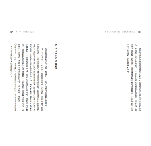 ◎最佳的兒童理財教育是:從引導孩子「累積財富」的教育,到教他們「忘了財富」的教育。