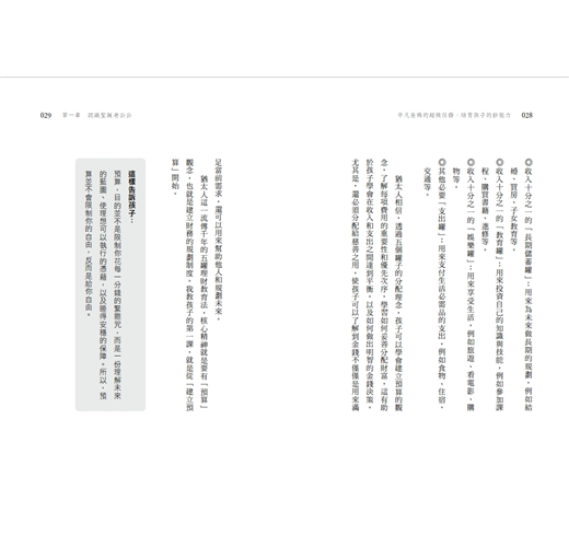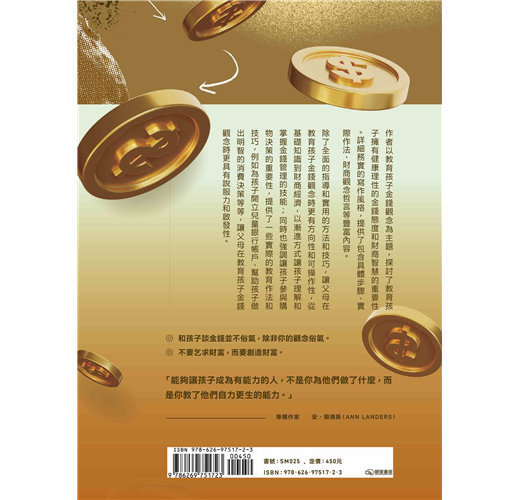 全書提供了全面的指導和實用的方法和技巧,讓父母在教育孩子金錢觀念時更有方向性和可操作性,從基礎知識到財商經濟,以漸進方式讓孩子理解和掌握金錢管理的技能;同時也強調了讓孩子參與購物決策的重要性,作者提供了一些實際的教育作法和技巧,例如為孩子開立兒童銀行帳戶、幫助孩子做出明智的消費決策等等,讓父母在教育孩子金錢觀念時更具有說服力和啟發性。