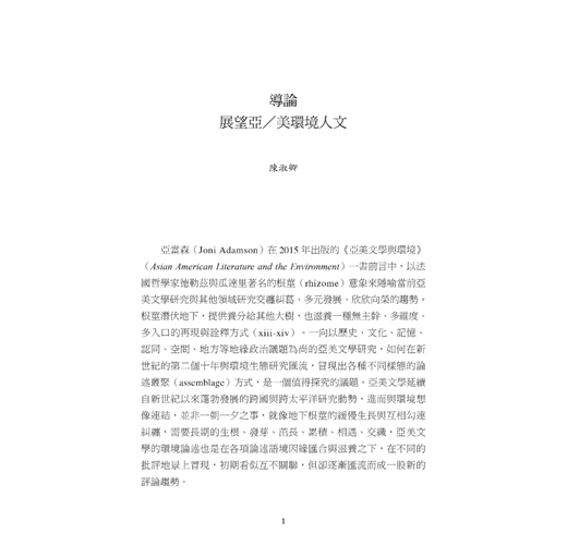 亞當森(Joni Adamson)在2015年出版的《亞美文學與環境》(Asian American Literature and the Environment)一書前言中,以法國哲學家德勒茲與瓜達里著名的根莖(rhizome)意象來隱喻當前亞美文學研究與其他領域研究交纏糾葛、多元發展、欣欣向榮的趨勢。根莖潛伏地下,提供養分給其他大樹,也滋養一種無主幹、多維度、多入口的再現與詮釋方式(xiii-xiv)。一向以歷史、文化、記憶、認同、空間、地方等地緣政治議題為尚的亞美文學研究,如何在新世紀的第二個十年與環境生態研究匯流,冒現出各種不同樣態的論述叢聚(assemblage)方式,是一個值得探究的議題。亞美文學延續自新世紀以來蓬勃發展的跨國與跨太平洋研究動勢,進而與環境想像連結,並非一朝一夕之事,就像地下根莖的緩慢生長與互相勾連糾纏,需要長期的生根、發芽、茁長、累積、相遇、交織,亞美文學的環境論述也是在各項論述語境因緣匯合與滋養之下,在不同的批評地景上冒現,初期看似互不關聯,但卻逐漸匯流而成一股新的評論趨勢。