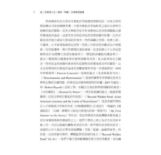 辛的勞動、人為的暴力或美學沉思所形塑,因此,正如奧圖卡(Paul Outka)所言,這本書的主要生態關切仍偏重「社會生態學、批判性的種族環境主義、環境正義」(Fitzsimmons et. al. xx ),而不是非人自然的生態,換言之,該書的生態論述以差異政治出發,強調特定歷史下,亞裔移民與自然環境的互動,以生態彰顯環境塑造人與人、族群與族群之間的社會正義問題。