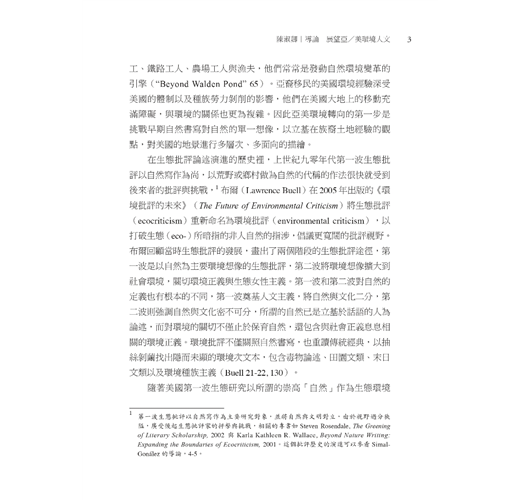 在生態批評論述演進的歷史裡,上世紀九零年代第一波生態批評以自然寫作為尚,以荒野或鄉村做為自然的代稱的作法很快就受到後來者的批評與挑戰,1 布爾(Lawrence Buell)在2005 年出版的《環境批評的未來》(The Future of Environmental Criticism)將生態批評(ecocriticism)重新命名為環境批評(environmental criticism),以打破生態(eco-)所暗指的非人自然的指涉,倡議更寬闊的批評視野。布爾回顧當時生態批評的發展,畫出了兩個階段的生態批評途徑,第一波是以自然為主要環境想像的生態批評,第二波將環境想像擴大到社會環境,關切環境正義與生態女性主義。第一波和第二波對自然的定義也有根本的不同,第一波奠基人文主義,將自然與文化二分,第二波則強調自然與文化密不可分,所謂的自然已是立基於話語的人為論述,而對環境的關切不僅止於保育自然,還包含與社會正義息息相