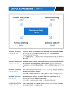 針對每個難度較高的進階主題詞彙,提供4個由短到長的句子,深入學習用同一個單字進行表達的方式。由於詞彙豐富度與文法複雜度是寫作與口說的評分標準,如果考生表達時使用的句子太過簡單,不但無法完整表達自身的想法,也難以獲得高分。利用此部分練習擴充句子的內容,並且嘗試較為複雜的句型結構,能夠有效提升寫作與口說的實力。而且,此部分涉及各種專門主題的深入探討,能夠加強考生對不同領域的熟悉度,避免在遇到比較困難的題目或術語時,發生詞窮、語塞的狀況。