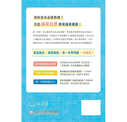 本書章節依照新課綱課本設計,一到六章的每個單元均包含「觀念綜整」與「素養題組」兩大部分;第七章則是專業師資專為高一學生解答的班群與學業常見問題。