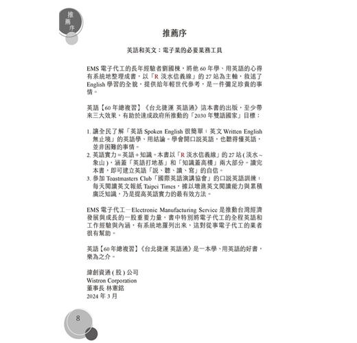 EMS電子代工—Electronic Manufacturing Service是推動台灣經濟發展與成長的一股重要力量,書中特別將電子代工的全程英語和工作經驗與內涵,有系統地羅列出來,這對從事電子代工的業者很有幫助。