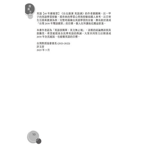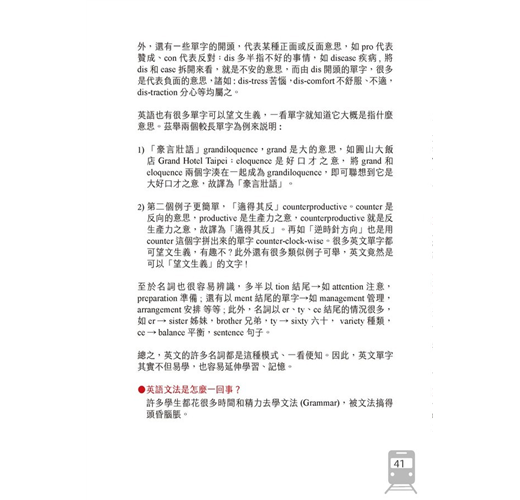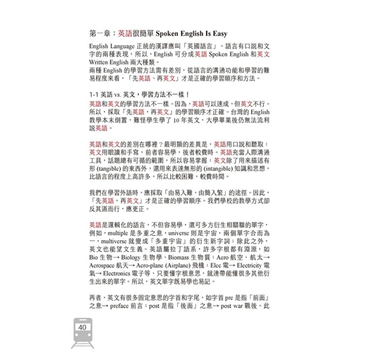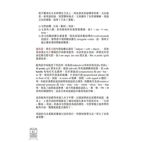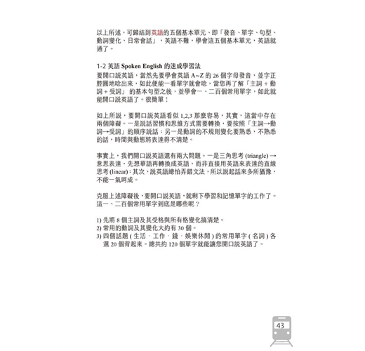 英語(Spoken English)很簡單,可以速成,但英文(Written English)無捷徑,一步一腳印。所以,學習方法應是「先英語,再英文」的順序。台灣學校裡的English教學卻是本末倒置,難怪學生學了10年英文,大學畢業後仍無法流利說英語。