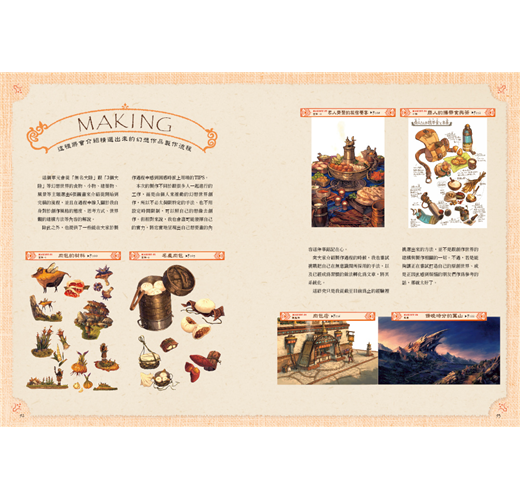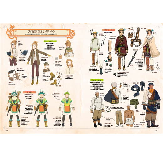 他的生活起居、周遭的人們、成功抵達無名大地後所遭遇的人事物與所見所聞,全都一幅幅精美的插畫或設定稿,並且在解說文字與設定文字的從旁輔助下,舉凡環境條件、風土民情、建築樣式、美味的餐飲、特殊生物習性、人物特質與服飾打扮等,圍繞著少年塔林的一切,彷彿也栩栩如生地在我們的眼前重現。