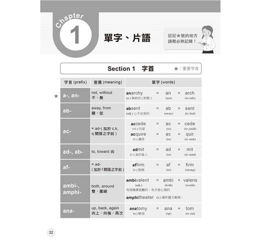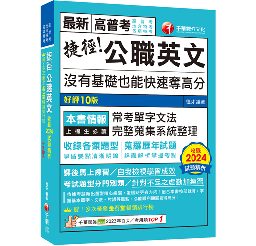 依據考試題型分列各個主題詳述,將考試重點詳細說明,並配合表格統整字首、字根、字尾的分類規則,以及易混淆相似字比一比,文法也分八大詞類、句型詳細剖析,會話、綜合測驗、閱讀測驗也列舉了情境式主題來練習。版面呈現清楚、美觀,藉由熟讀本書,讓你在高、普考等各類特考都能夠輕鬆應對,主題式的重點整理,高分上榜的最佳利器!