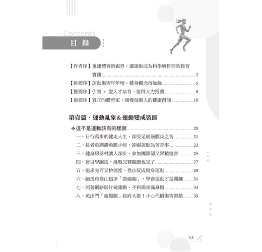 書局逛一圈,在運動保健的書籍中,增添許多國外單項運動的翻譯書籍,也出現不少素人教練談論運動議題,像是時下流行的重訓、跑步、瑜伽等專書,更有東方的中醫師和民俗療法師、西方的骨科醫師、復健師與物理治療師加入撰寫的行列。共同的特點皆是動作導向,圖解占據絕大部分的內文。國內欠缺一本書闡述為何要運動的觀念立論,該如何運動適合現階段的個人思辨與判斷?人們在運動現場行為表現的剖析為何?運動對於個人的幫助和對社會的影響又是如何?缺乏對社會大眾實際運動行為的瞭解,沒有運動教育的理論與實務相互結合的探究,更無賦予合理的教育學、社會學或倫理學和體育學的理論與解釋,催生了撰寫本書的起心動念。本書的目的是以臺灣實際發生的運動現況、聰明運動家教導的實務案例,經由運動科學指出重要議題所在,再用教育學、社會學等學科理論進行該現象的詮釋,達到運動教育的成效與待加強之處,透過深入的討論,提供讀者和運動教育從業者省思的重點。所以本書的架構主要為3大部分,第一部分為實際案例的鋪成,再由第二部分運動科學的視角進行運動應然的解釋,最後由本人於博士班研究學者的理論支撐起倫理學、社會學、教育學來詮釋運動現場的實然現象。讓運動教育,即體育,不再陷入各自象牙塔的認為,或在某單項運動或議題上,再度淪為動作的教導,應由教育的整體全貌來看待、來闡釋體育的面面觀,不再窄化或化約為某單項運動如此簡單。唯有提升國人對於正確運動觀念的樹立和有判斷標準的思考,運動學習才有意義,執行之後必見果效。