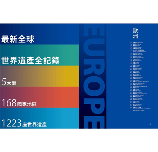 本書以50萬字詳實介紹遍及歐洲、亞洲、美洲、非洲、大洋洲168個國家共1223處世界遺產,搭配超過5000張照片、180張地圖,一書在手,暢遊全球!