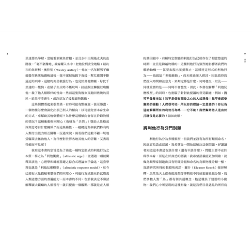 同理心並非無法測量的情感,在本書中是實實在在的科學。了解本身就是力量,為了幫助更多的人,我們從了解人類行為出發。只要知道是什麼引發它們、什麼抑制它們,我們或許可以更有效地應用,拓展到善行推廣,並且幫助到真正需要的人。