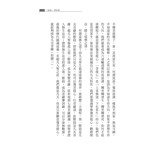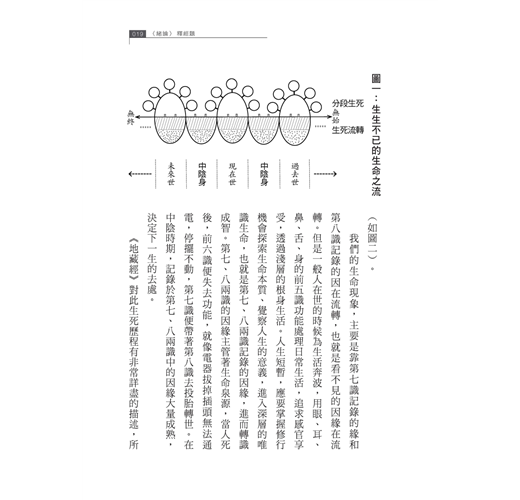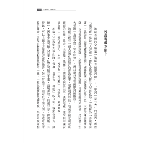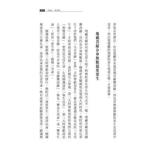 由於《地藏經》的經文質樸易讀,結構層次分明,所以本書解經依傳統科判表,分為三分:序分、正宗分及流通分。「序分」開場,即是第一品〈忉利天宮神通品〉,說明《地藏經》緣起於佛陀到忉利天為母說法,而有這部經典。