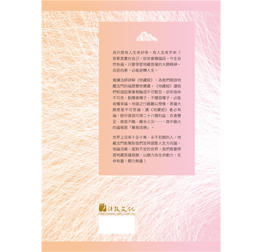 《地藏經》讓我們知道因果業報輪迴不可輕忽,卻非宿命不可改,勤種善種子,不種惡種子,必能收穫幸福。
