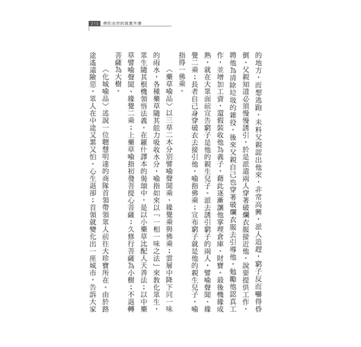另外,本書還值得讀者關注的是,黃教授在導讀之後,常會苦口婆心地對讀者進行勸勉,比如在《雜阿含經》導讀後說:「《雜阿含經》幫助學佛者放下對生命存在的執著,完成定慧的修學。如果放不下對生命存在的執著而從事大乘佛法的入世踐行,易淪為有漏的人天善法而不自知。反之,能以不執取三界存在的出世精神來利益眾生,始為真正的大乘菩薩道。」作者提點讀者放下對生命存在的執著,是大乘佛法入世踐行的重要課題。