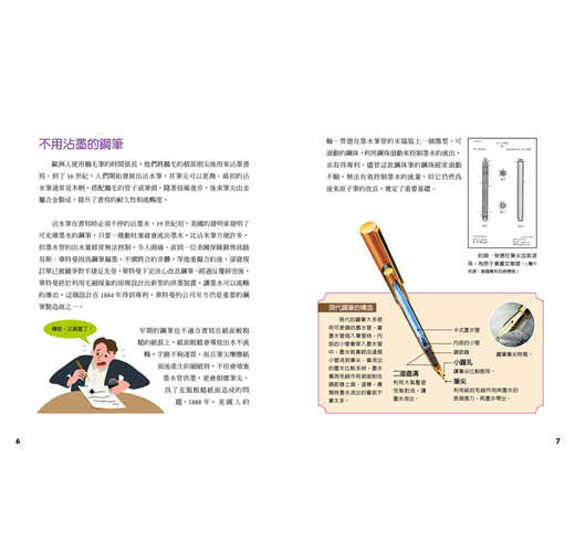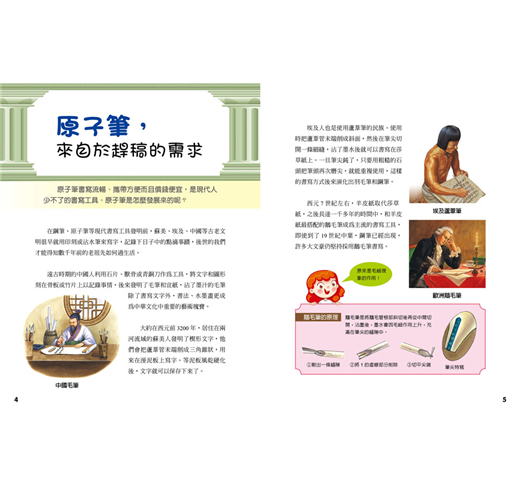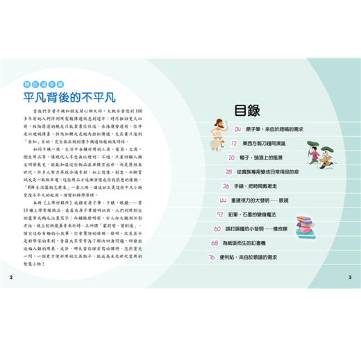 「WOW生活萬物怎麼來」一套三冊,依生活物品的性質劃分為「上學好夥伴」、「居家小幫手」及「科技百寶箱」三個主題,每本書收錄10個平凡而重要的發明,有趣的內容佐以珍貴歷史圖片、幽默的小插畫,看完它們背後的起源和演變,保證你會驚呼連連,今後對它們刮目相看!