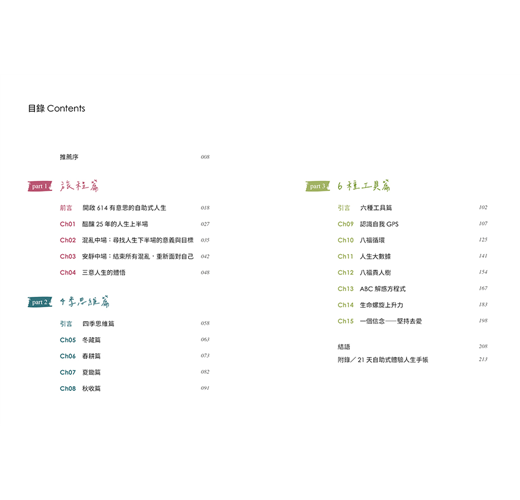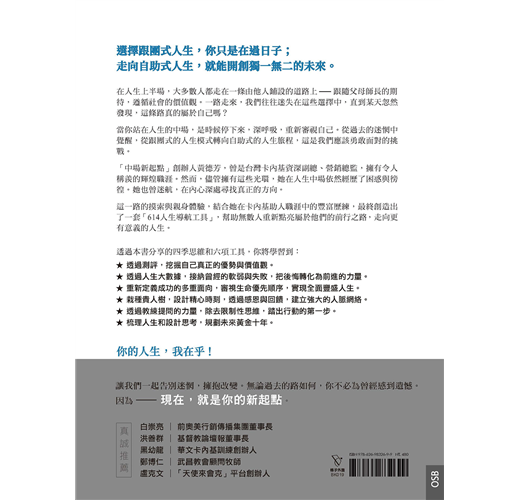 這就是我所依循的「614人生導航工具」實用原則,希望能透過自身經驗及學員成功案例分享,成為陪伴讀者的人生指南工具書。