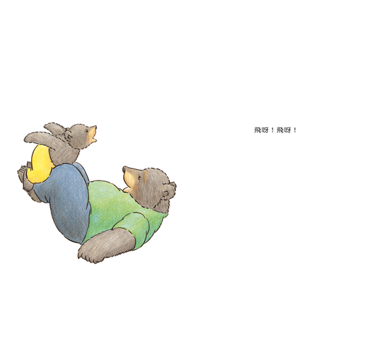 小熊跟爸爸一起玩,一會兒把小腳踩在爸爸的大腳上走路,一會兒又被爸爸高高舉起,還可以騎在爸爸的肩膀上,再溜下來給爸爸背,真是開心!作者以質樸的色鉛筆畫風,搭配大量留白的頁面,刻畫出親子共玩的溫度與生活感,也充分展現孩子愛玩、喜歡爸爸陪伴的親密與滿足感。