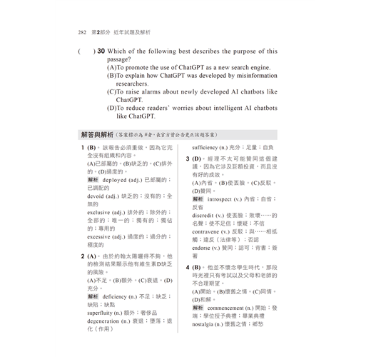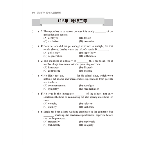 實際的演練是各類考試的勝負關鍵,本書在書末特別整理了近年最新試題,藉由實際的大範圍考題,可自我檢視學習成效。建議可先利用模擬題庫加強弱點,再來練習歷屆試題,寫過後再對答案,錯誤的題目亦可先自行思考,若真的沒辦法再參考解析,針對弱點加強複習。如此才能有效地完成自我複習、精進的考試目標,非常適合考前衝刺使用。