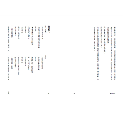 過了一段時間,我看出侘寂同樣適用於物質與環境的性質、情感狀態、道德倫理的選擇乃至於精神態度。然而,我在做了一些研究之後發現,侘寂不是既有或正式的詞彙,也就是說,它從未用於書面或學術作品。此外,侘寂也與茶會的物品與行為沒有直接關係。「侘」與「寂」確實源自日本中世紀,但「侘寂」這個意義含糊不定的口語詞彙則非如此。我發現,這個語義學上的建構物可以符合我所追尋的那種「審美感受的覺察」—也就是美。