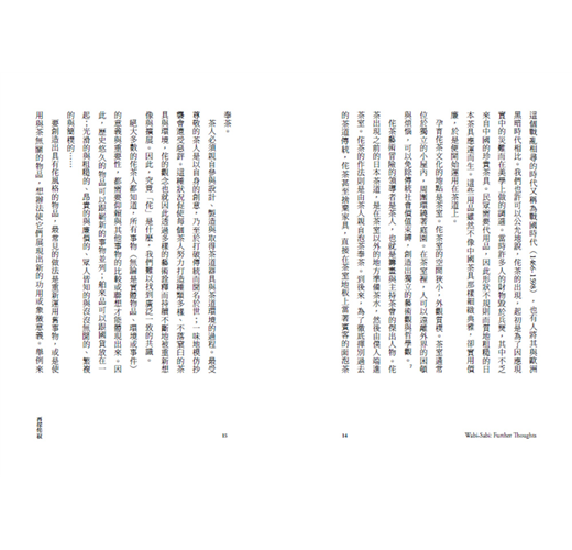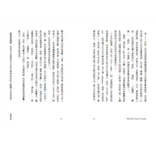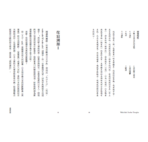 這樣的定義,若從表面理解,便容易成為平面呆板的想像,造就許多物事空有侘寂之名,卻與核心精神無關,甚至背道而馳。於是,科仁潛入侘寂的源頭,從詩歌、茶道、禪宗等起點探看概念成形的背景與演變,再梳理其發展與衰微。當我們認識侘寂的形成過程,便能體會這些特質並不是獨斷的美學判準,更不是要求人模仿的指導原則,而是對於環境、物件、心境與感受更全盤的包容、欣賞與價值再發現。