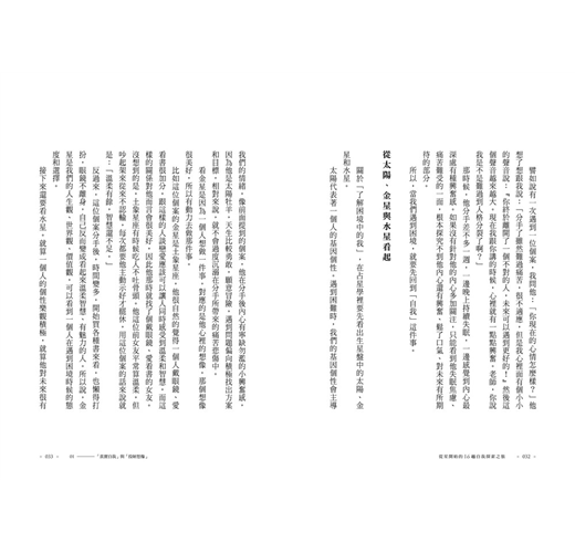 書中對星盤的詮釋並不僅限於神祕的占星象徵,而是融合了白瑜在心理學和哲學方面的深厚學識,並結合他自己的人生經驗,讓每一個星象解讀都帶有深刻的見解和思維廣度。這樣的占星不僅僅是「命運」的解讀,更是一種科學與靈性結合的自我分析過程。