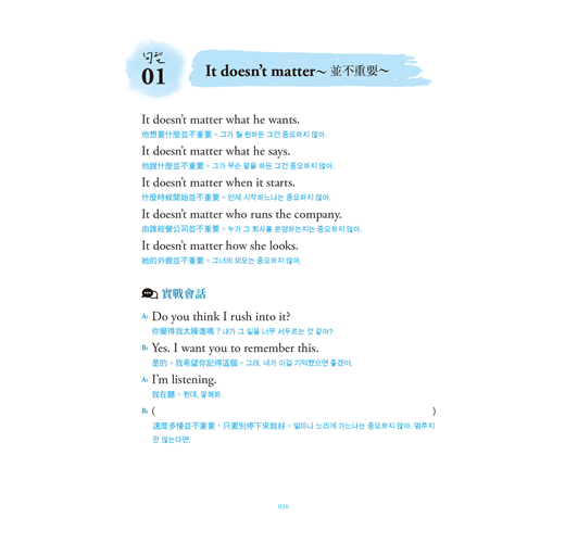 ★精心挑選40個句型:每篇包含精采短文+常用句型+5個造句+實戰對話,在你因負能量堆積而感到疲倦時,瞬間扭轉情緒。