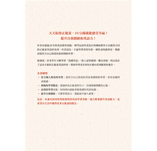 作者有超過20年的英語教學經驗,專門為初學者設計與傳統教學方式截然不同的正能量英語抄寫書。作者認為,不論學習者的年齡、個性或知識背景,都應該從符合自己程度的素材開始學習。