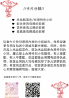 這套卡片的分類,Sangeeta特別選用台灣的中部城市,藉此,希望讓更多朋友知道中部城市觀光景點,同時,Sangeeta特別放入米血糕菜色,因為米血糕是台灣特別的小吃,屢次登上台灣特別小吃報導,有人很喜歡、有人不喜歡,但這都是台灣獨有的特色食物,就像台灣的大地母親包容了多元族群的我們。希望用這套作品,啟發更多朋友用包容的心來關懷偏鄉地區。謝謝大家。