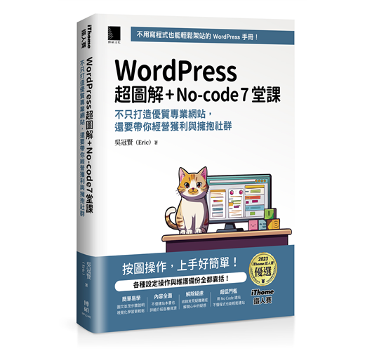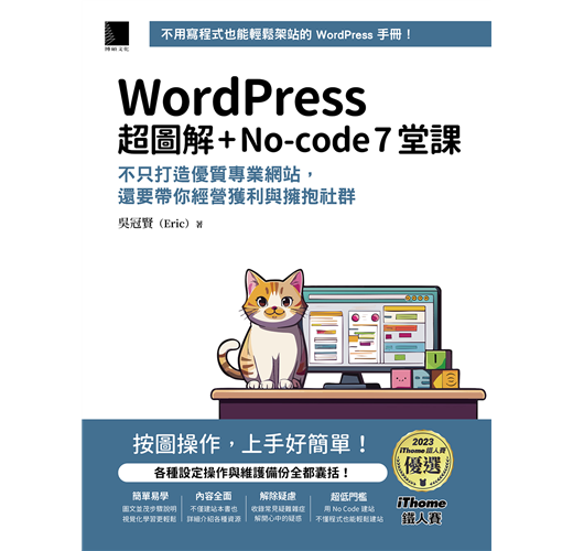 本書改編自第 15 屆 iThome 鐵人賽 WordPress 組優選系列文章《從零開始的 WordPress 之旅:建站、使用、擁抱社群》,結合作者過去使用 WordPress 的實戰經驗,讓你不需要程式碼的基礎,就能打造專業且獨特的網站。
