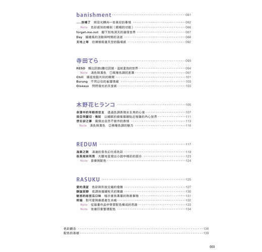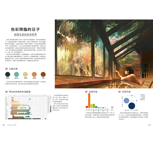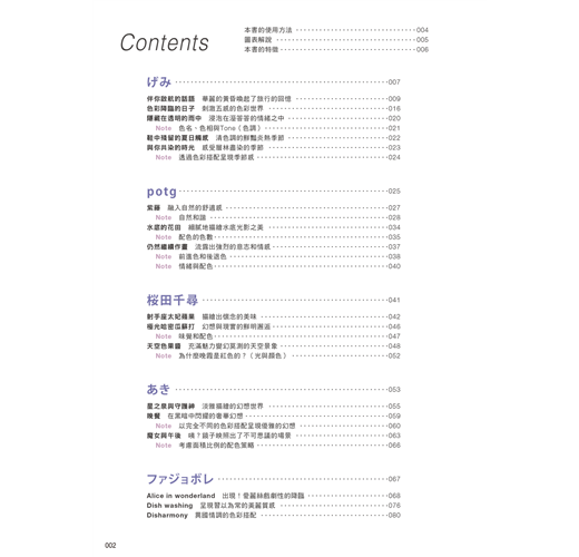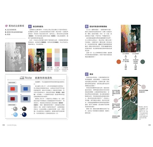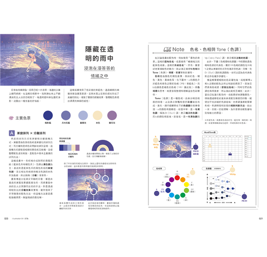 色彩搭配是插畫家憑感覺創作出來的產物,但用色看起來卻是如此簡單又合乎常理。不過只要理解鑑色技巧及配色結構,任誰都可以運用自如。為此本書將顏色與配色的相關基礎知識,濃縮成了「Note」專題。