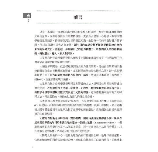 總之,這本書結合了各種專門知識,希望在人格分析方面能為讀者提供詳盡有用的參考工具書。在綜合了多年研究、複雜的占星術和圖表解析經驗、以及成千上萬個人格分析案例的研究,但願我們能幫助讀者更深入地認識自己和他人的性格、能力和潛力。現在讓我們一起進入366天中的每一天。每天就如同每個人的新生一樣,是那麼獨特又充滿希望。