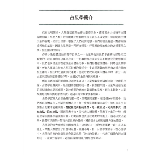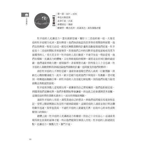 在整體模式中,一切事物都與其他事物相互關聯。同樣的,占星學中十二星座深植了個體和全人類的靈魂,儘管個人出生在特定的星座,但為了與整體協調,他或她必須和其他十一個星座連動。我們都有十二星座的所有面,但太陽星...