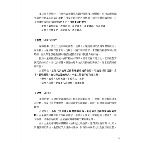 每一顆行星代表一種心理功能,與我們的人格某些方面一致。行星的位置及彼此的關係暗示著性格特徵。在占星學中,包含太陽和月亮被稱為「發光天體」在內的十大行星,構成我們太陽系。下面是每個行星的相關資訊。