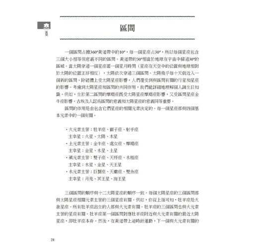 將黃道帶畫分為十二星座,這些星座進一步細分,每一畫分區域都與其他影響力有關。每個星座畫分為三,稱為「區間」。每一個區間覆蓋黃道帶10º,每個星座的三個區間,對星座本身的特點起輔助和補充作用。每個區間都與另一個星座和行星有關。在這本書中,讀者不僅能找到自己出生的星座,還能找到出生區間。