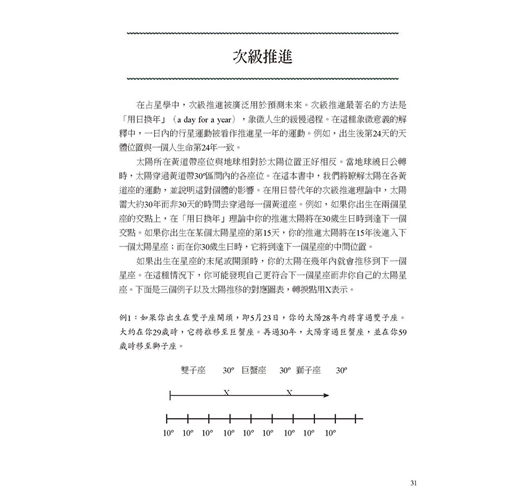 我們還能使用占星術預測未來,叫做次級推進(progression)。占星家用太陽的推進來表示一個人生命中的重要年分。這樣的 人生隨著太陽推進座位改變的人生轉捩點,一生約有三次。