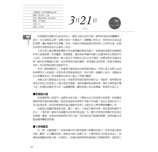 以365天的生日為基礎,運用星座移轉間的關連,分析每個人的人格特質、職業運勢、以及關於愛情與人際關,並提供最佳愛情、友情、貴人、伴侶、小人、知己等生日供讀者查閱。