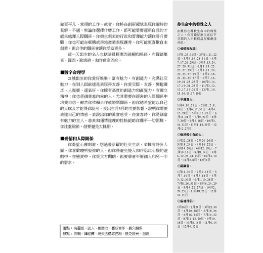 書中〈真實的自己〉這一部分,揭示了一個人潛在的優缺點。本書還提供建議每一個誕生日適合的職業,以及當天出生的著名人物。