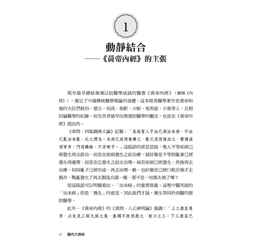 我查證資料,最早的體內環保根源來自五千年前《黃帝內經.素問.六微旨大論》主張的「動靜結合」――「動可養形,靜可養神」,形神共養,生命活動才能統一協調。而且,「清淨則生化治」與「靜則神藏」,說明人體氣機升降出入的絕對運動和相對靜止,都是新陳代謝所必須的。這是史上最早提出的體內環保觀念。