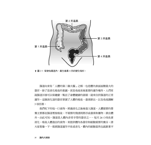 我們吃下的每一口食物,經過消化之後會進入腸道,人體需要的營養主要都在腸道裡被吸收,不需要的殘渣則將形成毒素和廢物,排出體外。由此可知,腸道是人體內非常辛勞的器官之一,每天24 小時負責消化、吸收人體進出的食物,來提供體內各器官和細胞需要的養分。請大家想像一下,假使腸道運作不佳或老化,體內的細胞當然也就跟著不健康或衰老。如何讓我們的腸道維持青春有活力,是你我重要的課題,也是2000 年來,傳統醫家提醒我們要注重的清體術」。