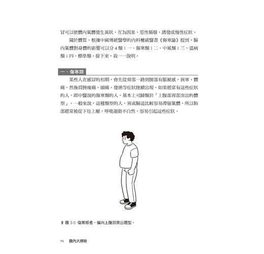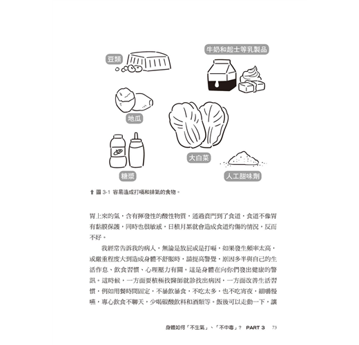 書中根據中國傳統醫學的內科權威醫書《傷寒論》提到的四種體型,依序介紹飲食原則供讀者參考。藉由自我診斷是否有脹氣,到食物的選擇,以及有助排氣的運動怎麼實行,莊醫師詳細解說滯留氣體對健康的危害,希望每個人都能從生活細節著手,逐步刪除對己無益的習慣。