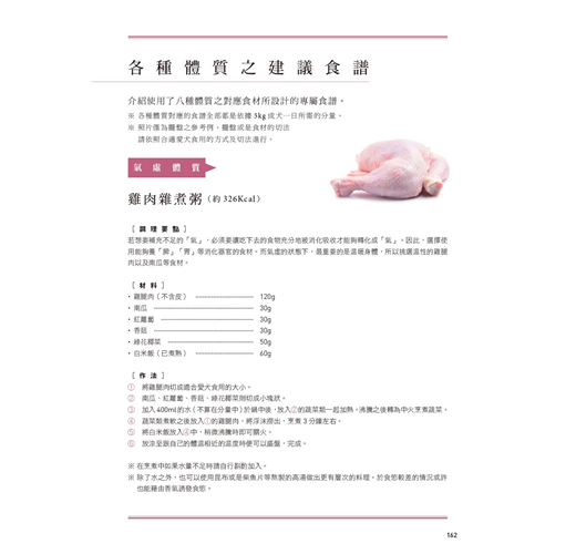本書由寵物營養師、獸醫師與中醫師共同執筆,結合營養學的基礎知識、獸醫學的犬隻健康管理以及中醫學的食養智慧,從狗狗藥膳與食療觀點出發,精心挑選出144種常見食材,進行五味(酸苦甘辛鹹)、五性(熱溫寒涼平)以及營養成分等完整分析,搭配氣虛、血瘀、痰濕等八種愛犬體質與中醫功效對症,設計出簡單好上手的食療食譜,幫助飼主全面調配愛犬的健康飲食。
