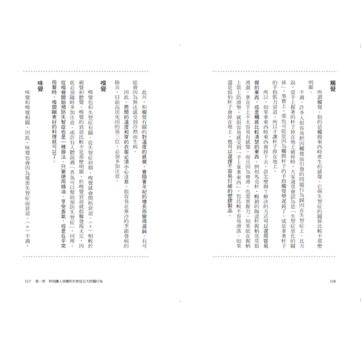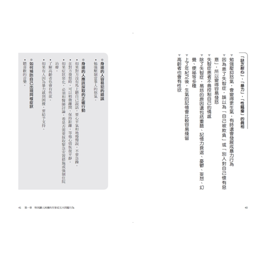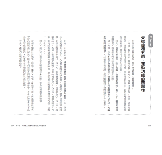 ․這本書讓我因為知道年長者對時間的感覺和年輕人完全不同,還有知道觸覺、嗅覺、視覺衰退的影響,讓我能冷靜對應失智症患者。內容寫得相當仔細,也有案例,非常好閱讀。——lucky lady