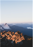 當我前進到岩壁上方的平地時,向下俯視深邃遼闊的圈谷,而另一頭悄然日出的大景震撼登場。四周寂靜無聲,唯有高山清新的空氣伴隨著我。小小的橘紅色太陽在天際緩緩升起,日光逐漸彌漫開,天空隨之變成一幅魔幻的畫卷。如詩如畫的橘紅星辰穿梭在寧靜的天際,勾勒出一幅極富詩意的場景。在這一刻,我勞累的身體和清澈的靈魂完美交融,愛與湮滅的旋律同時響起,夜與日重疊。漸漸清晰的天空映照著南湖大山的每寸山脈,每一道深邃的褶皺彷彿是山神的指紋,顯明祂在人間漫長的地質年歲。