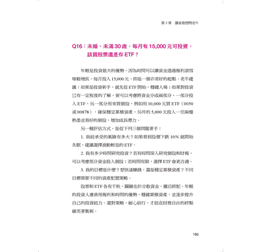 特別推薦最後一章,新手務必看:市場波動是常態,接受它、操練它,做好功課,不要當「聽消息的散戶」。記住:投資就像穿鞋跑馬拉松,鞋不合腳,剛開始或許不覺得不舒服,但跑到一半就會起水泡,最後無法完成賽程。做一頭步伐穩健的老牛,雖然走得慢,但能走得遠,最終悠遊在股海之中,從容抵達財富自由的彼岸。