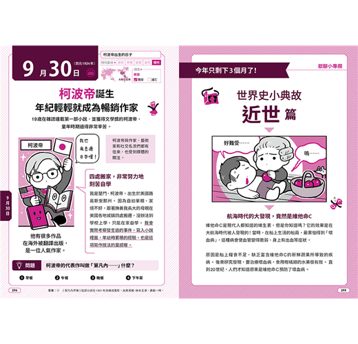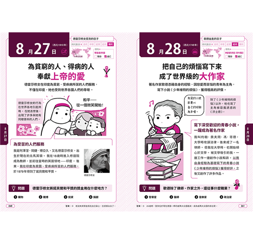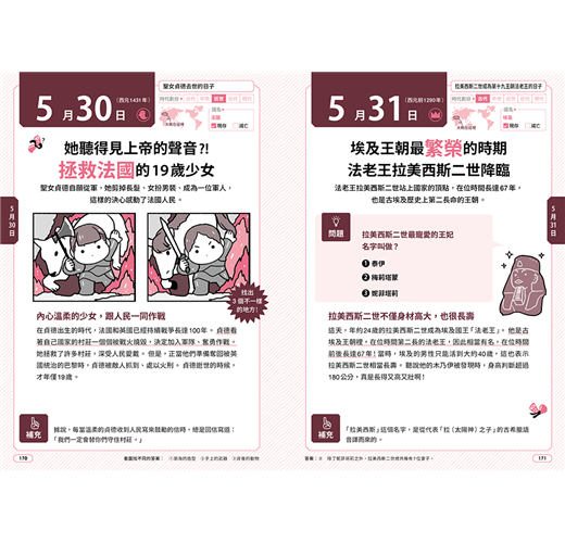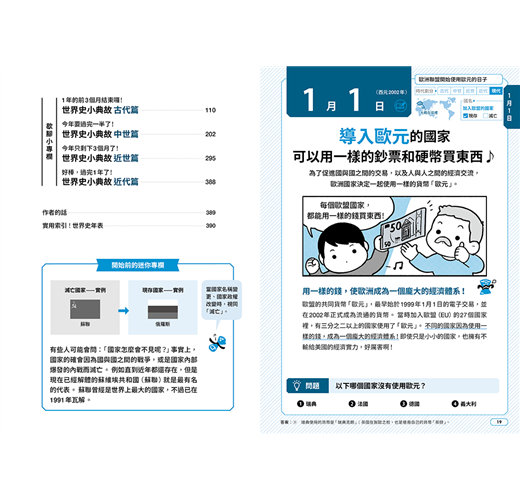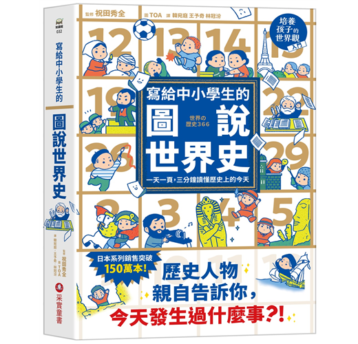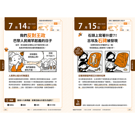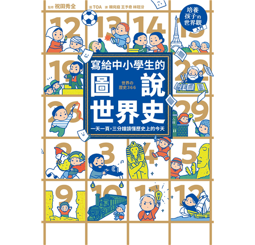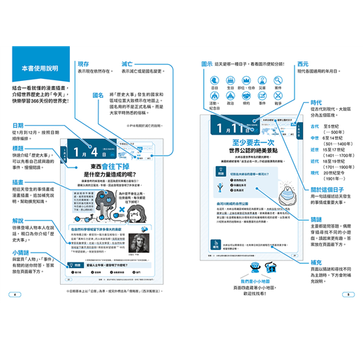 介紹366個世界著名的歷史事件,一天一頁,只要每天花三分鐘,就能掌握歷史上的今天,發生了哪些影響世界的人事物。全書透過豐富精采的單格漫畫、猜謎問答、看圖找不同……等有趣互動,幫助孩子學習各種基礎知識。