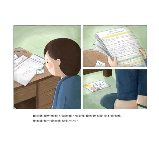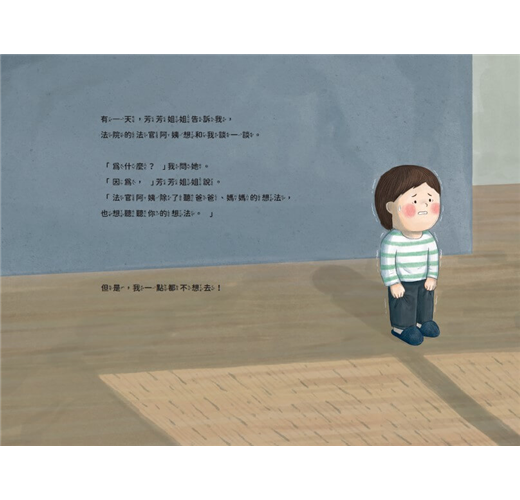繪本的故事從家庭關係出現問題開始,描寫了孩子面對即將破碎的家庭和情感變化的過程。透過志工姐姐的角色,引導孩子理解並接納自己的情緒,並且透過繪本中的知識頁面,讓孩子們了解法院的運作方式,進而消除對法院的恐懼和陌生感。
