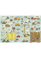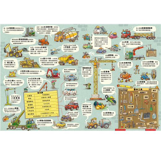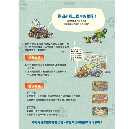 總共52則工程車故事:每輛工程車都有獨立的故事線,藏在精美的插畫場景中,等著你去找尋並了解他們的生活習慣與獨特個性!